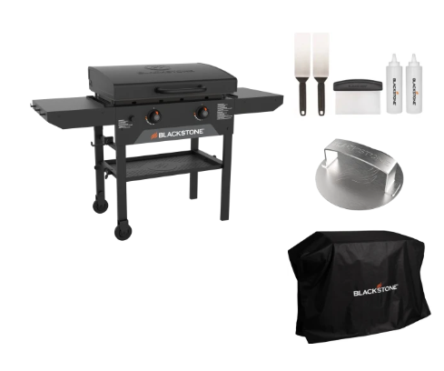 Bundle includes 28” Omnivore Griddle with Hood, long spatulas (Qty. 2), griddle scraper (Qty. 1), 16 oz squeeze bottles (Qty. 2), Smash Burger Press, and 28” Griddle Cover.